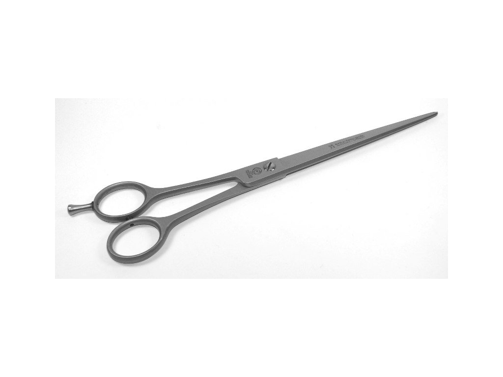 Profesionální stříhací nůžky s mikrozuby, rovné. Délka 9" ( 22,9cm). Vyrobeno z nerezové oceli, ruční výroba, tvrdost oceli 56 HRC. Matné provedení ( tzv. "satén"), s opěrkou na prst a se šroubem pro individuelní nastavení,odolné proti opotřebení. Mikrozuby slouží k přesnému stříhání a zabraňují klouzání a "ujíždění" ststi mezi břity nůžek, napomáhají tím k přesnému střihu. Leštěné ( honované) ostří. Stříhání je díky mikrozubům snadnější a méně pracné. Vhodné pro univerzální použití pro salony i chovatele.